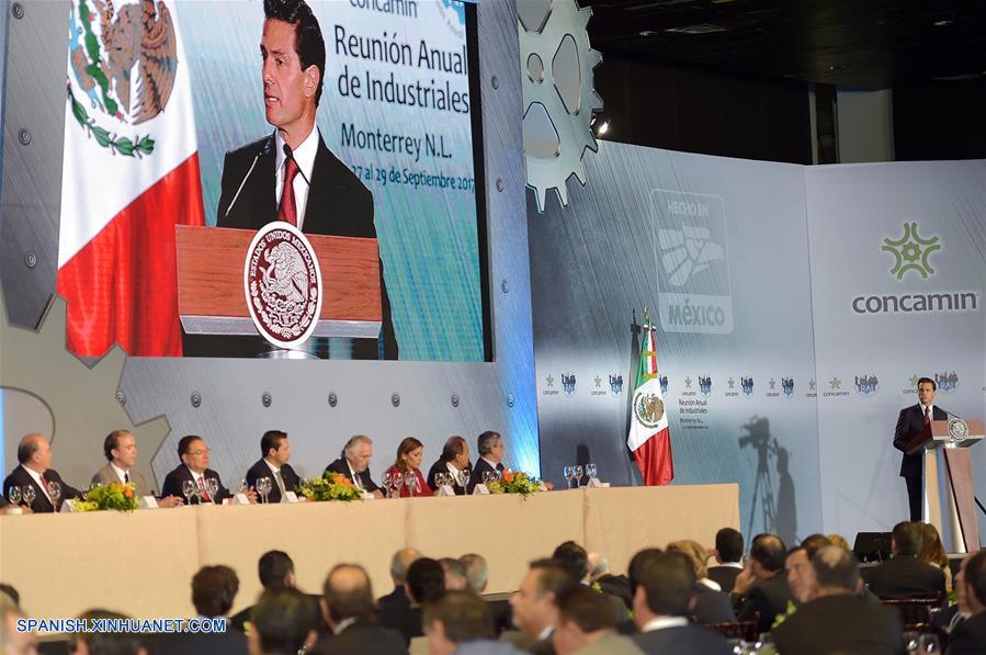 CIUDAD DE MEXICO, septiembre 29, 2017 (Xinhua) -- Imagen cedida por la Presidencia de México, del presidente mexicano, Enrique Pe?a Nieto (d), pronunciando un discurso durante la clausura de la Reunión Anual de Industriales 2017, en Monterrey, estado de Nuevo León, México, el 29 de septiembre de 2017. El presidente de México, Enrique Pe?a Nieto, aseguró el viernes que gracias a las "finanzas públicas sanas y mecanismos institucionales", se podrá solventar gran parte de la reconstrucción de las zonas afectadas por los recientes terremotos del 7 y 19 de septiembre, que afectaron principalmente al centro y sur del país, al tiempo que pidió apoyo al sector privado que reconoció su apoyo. (Xinhua/Presidencia de México)