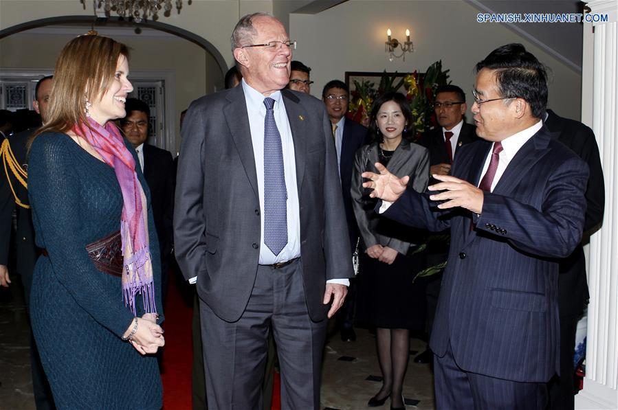 LIMA, septiembre 29, 2017 (Xinhua) -- Imagen del 28 de septiembre de 2017 del embajador de China en Perú, Jia Guide (d), conversando con presidente de Perú, Pedro Pablo Kuczynski (c), y la presidenta del Consejo de Ministros peruano, Mercedes Aráoz (i), durante la ceremonia de celebración del 68 aniversario de la fundación de la República Popular China, en la embajada de China en Perú, en el distrito de San Isidro, Lima, Perú. "Lo que ha mostrado la República Popular China desde que se fundó en 1949 es un cambio absolutamente extraordinario en los anales de la historia mundial, ha habido momentos dolorosos pero se ve que hay un progreso constante", dijo el jueves el presidente de Perú, Pedro Pablo Kuczynski. Al intervenir en las celebraciones con motivo del Día Nacional de China en la embajada del país asiático en Lima, el mandatario peruano resaltó los lazos históricos, comerciales y productivos, que unen a los dos países, y se pronunció por ampliar lazos en el ámbito de la tecnología e infraestructura. Kuczynski a?adió que iba a tener el placer de reencontrarse con el presidente chino, Xi Jinping, en el marco del Foro de Cooperación Económica de Asia-Pacífico (APEC) en Vietnam, en noviembre próximo. (Xinhua/Luis Camacho)