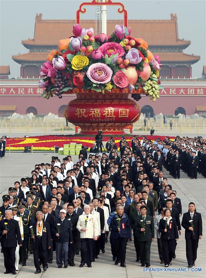 Una ceremonia se lleva a cabo para presentar flores ante el Monumento a los Héroes del Pueblo, en honor a los héroes nacionales durante el Día de los Mártires del país, en la Plaza de Tian'anmen, en Beijing, capital de China, el 30 de septiembre de 2017. (Xinhua/Yao Dawei)