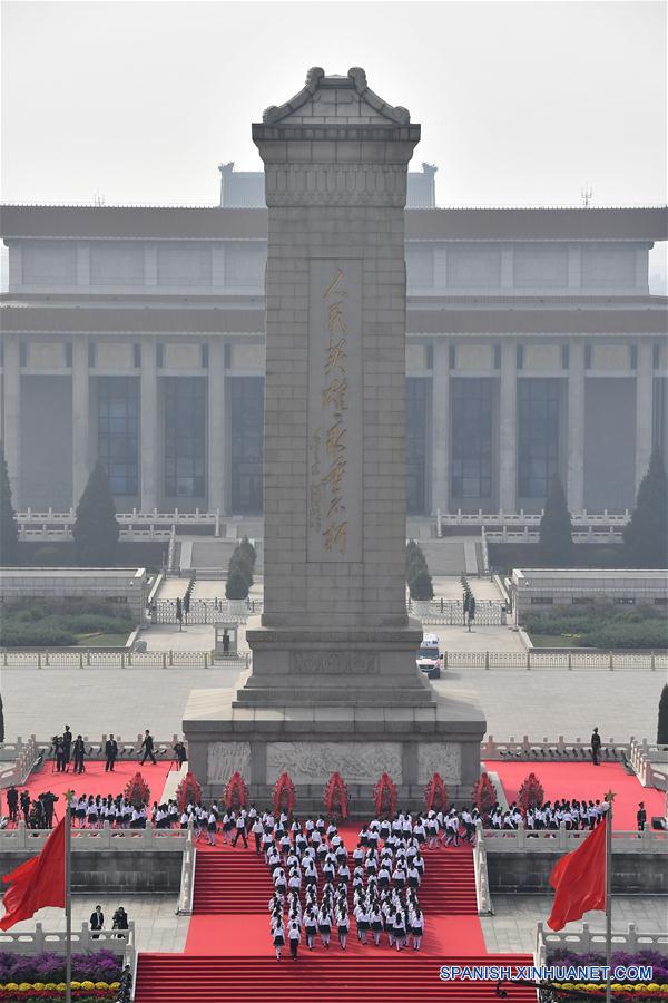 Una ceremonia se lleva a cabo para presentar coronas de flores ante el Monumento a los Héroes del Pueblo, en honor a los héroes nacionales durante el Día de los Mártires del país, en la Plaza de Tian'anmen, en Beijing, capital de China, el 30 de septiembre de 2017. (Xinhua/Yan Yan)