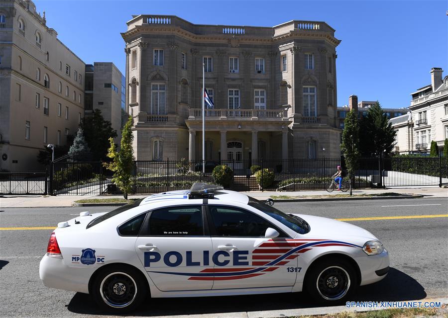 Una patrulla permanece frente al edificio de la embajada de Cuba en Washington D.C., Estados Unidos, el 3 de octubre de 2017. El gobierno de Estados Unidos anunció el martes que solicitó la salida de 15 diplomáticos cubanos de la embajada de Cuba en Washington en respuesta a los misteriosos "ataques" que condujeron al retiro de algunos miembros de la embajada estadounidense en La Habana. (Xinhua/Yin Bogu)