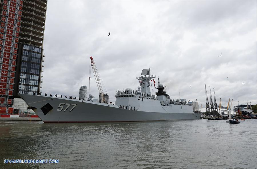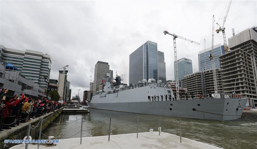 LONDRES, octubre 7, 2017 (Xinhua) -- La fragata de misiles guiados Huanggang, de la 26 flota de escolta naval china, sale de los Muelles de las Indias Occidentales en Canary Wharf en el este de Londres, Reino Unido, el 7 de octubre de 2017. La 26 flota de escolta naval china se retiró del lugar el sábado luego de una visita amistosa de 5 días a Reino Unido. La flota, compuesta por las fragatas de misiles guiados Huanggang y Yangzhou, y el buque de suministro integral Gaoyouhu, llegaron el martes a Canary Wharf, en el este de Londres, la tercera parada de su viaje global luego de completar su misión de escolta en agosto en el Golfo de Adén y aguas somalíes. (Xinhua/Han Yan)
