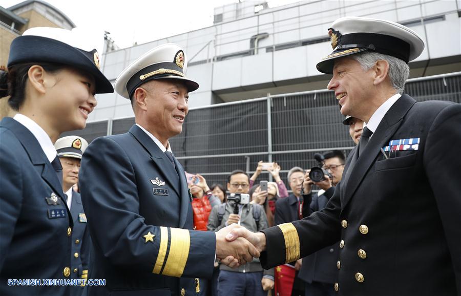 LONDRES, octubre 7, 2017 (Xinhua) -- El comandante de la 26 flota de escolta naval de China, Wang Zhongcai (2-i-frente), estrecha la mano de David Elford (d-frente), comandante regional de la Marina Británica para el este de Inglaterra, durante una ceremonia de despedida en los Muelles de las Indias Occidentales en Canary Wharf en el este de Londres, Reino Unido, el 7 de octubre de 2017. La 26 flota de escolta naval china se retiró del lugar el sábado luego de una visita amistosa de 5 días a Reino Unido. La flota, compuesta por las fragatas de misiles guiados Huanggang y Yangzhou, y el buque de suministro integral Gaoyouhu, llegaron el martes a Canary Wharf, en el este de Londres, la tercera parada de su viaje global luego de completar su misión de escolta en agosto en el Golfo de Adén y aguas somalíes. (Xinhua/Han Yan)