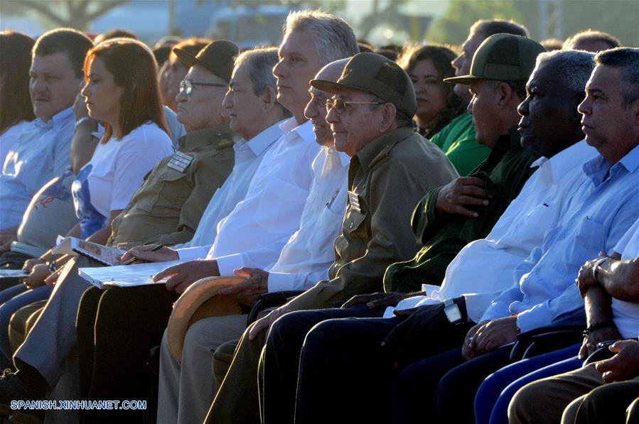 SANTA CLARA, octubre 8, 2017 (Xinhua) -- El presidente cubano, Raúl Castro (c), asiste al acto de homenaje al comandante Ernesto "Che" Guevara, a 50 a?os de su muerte en Bolivia, en Santa Clara, Cuba, el 8 de octubre de 2017. El presidente cubano Raúl Castro rindió el domingo homenaje al mítico comandante guerrillero cubano-argentino Ernesto "Che" Guevara, cuya caída en combate cumple 50 a?os. En la explanada ubicada frente al Memorial se realizaba el acto de homenaje a Guevara, conocido en la isla como el "Guerrillero Heroico", a 50 a?os de su muerte en Bolivia y a dos décadas de la llegada de sus restos a Cuba. (Xinhua/Joaquín Hernández)