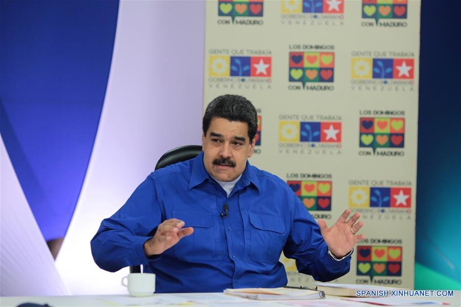 CARACAS, octubre 8, 2017 (Xinhua) -- Imagen cedida por la Presidencia de Venezuela, del presidente venezolano, Nicolás Maduro, participando durante su programa "Los domingos con Maduro" en Caracas, Venezuela, el 8 de octubre de 2017. El presidente de Venezuela, Nicolás Maduro, reveló el domingo que su gobierno sostiene "reuniones privadas" con dirigentes de la fracción opositora Mesa de la Unidad Democrática (MUD), para avanzar en el diálogo iniciado en República Dominicana en septiembre pasado. (Xinhua/Presidencia de Venezuela)