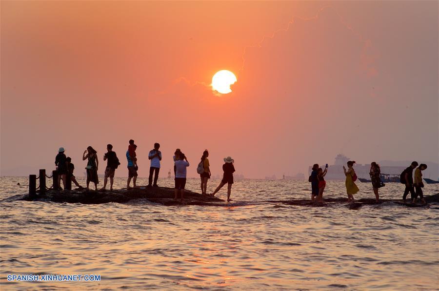 FUJIAN, octubre 1, 2017 (Xinhua) -- Turistas observan el amanecer en la playa en Baicheng, en la ciudad de Xiamen, en la provincia de Fujian, en el sureste de China, el 1 de octubre de 2017. Los chinos comenzaron sus vacaciones de ocho días de duración con motivo del Día Nacional y el Festival de Medio Oto?o. (Xinhua/Jiang Kehong)
