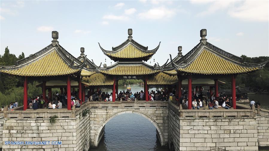 JIANGSU, octubre 8, 2017 (Xinhua) -- Imagen del 6 de octubre de 2017, de turistas disfrutando en la zona escénica del Delgado Lago Oeste en Yangzhou, en la provincia de Jiangsu, en el este de China. China fue testigo de más de 710 millones de viajes turísticos durante los feriados de ocho días del Día Nacional y el Medio Oto?o, llegando a cerca de 590 mil millones de yuanes (88.68 mil millones de dólares estadounidenses) en ingresos del turismo, de acuerdo con la Administración Nacional de Turismo. (Xinhua/Meng Delong)