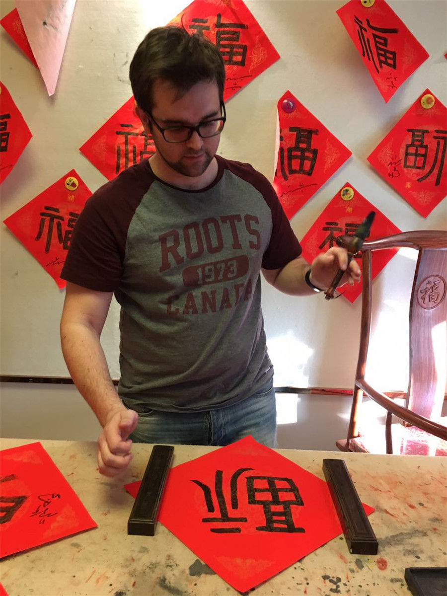 Un extranjero escribe el carácter chino “fu” (felicidad) con un pincel de escritura para celebrar el Festival de Primavera en Nanjing, provincia de Jiangsu, el 28 de enero. [Foto de Matthew Smith (Reino Unido) / Para China Daily]