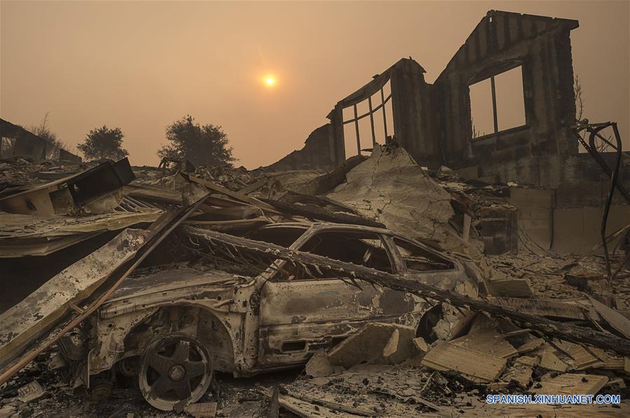 Vista de una casa y un automóvil da?ados por un incendio forestal, en la zona de Rincon Ridge en el condado de Sonoma en Santa Rosa, estado de California, Estados Unidos, el 10 de octubre de 2017. El número de muertos por los incendios forestales en California subió a 15 luego de que se confirmaron decesos en varios condados cerca de San Francisco, oeste de California. (Xinhua/Paul Kitagaki Jr/Sacramento Bee/ZUMAPRESS)