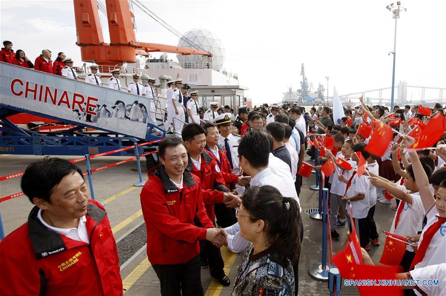 Los miembros del equipo chino de expedición científica son recibidos a su regreso a Shanghai, en el este China, el 10 de octubre de 2017. El rompehielos chino Xuelong (Dragon de Nieve) regresó el martes a su base en Shanghai después de 83 días al borde del Artico, completando su octava expedición ártica. (Xinhua/Fang Zhe)