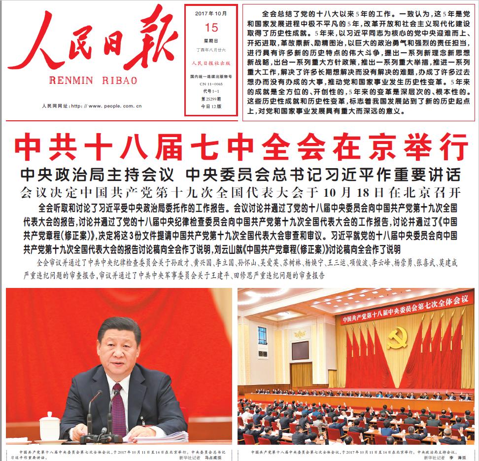 Diario del Pueblo, periódico oficial del Comité Central del Partido Comunista de China, informó el 15 de octubre sobre la Séptima Sesión Plenaria del XVIII Comité Central del PCCh. En la reunión se confirmó la expulsión del partido de doce personas, entre ellas Sun Zhengcai.