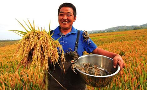 Un productor de arroz en el distrito de Hengshan de la ciudad de Yushan, en la provincia de Shaanxi, disfruta del doble beneficio que aporta el cultivo de arroz con cangrejos de río. Imagen del sitio web del Gobierno Popular de Distrito de Hengshan en Yulin