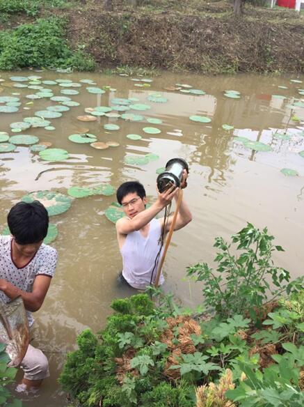 Una lluvia repentina llevó la bomba de agua de un local al río. La imagen muestra a Shi Shengyu, periodista de Diario del Pueblo enviado a la peque?a aldea pobre de Weidianji en el pueblo Shaogang del condado Yucheng en la provincia de Henan, ayudando al aldeano para recuperar la máquina del río.