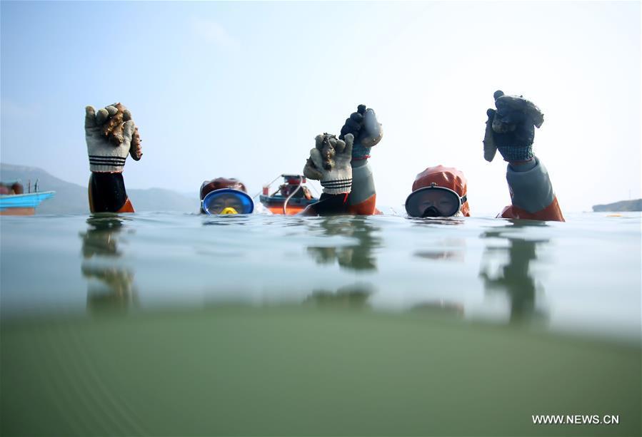 Feng Yan (izquierda) y Qiu Gang muestran pepinos de mar recién recolectados en las costas de la isla Luming en Dalian, provincia de Liaoning. Este tipo de pepino de mar es reconocido por su delicadeza y altos nutrientes. Los pescadores locales están muy ocupados con la grata "cosecha" de este a?o. 21 de octubre del 2017. [Foto: Xinhua]