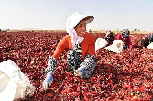 Los agricultores de Xinjiang secan los pimientos de pigmento al sol. El pigmento de estos pimientos es de muy alta calidad gracias a los recursos naturales locales, y es utilizado por muchas marcas internacionales. Según los residentes, se estima que el rendimiento del pimiento es de 1500 a 2000 de yuanes por mu (cerca de 0.07 hectáreas).