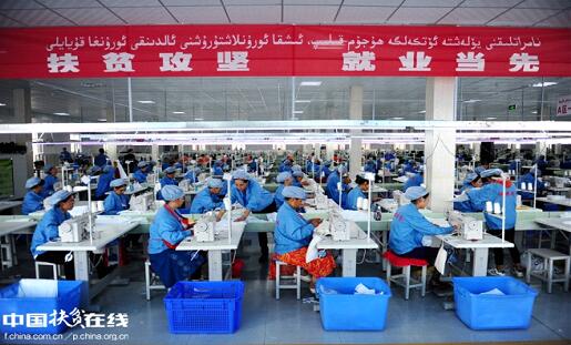 Funcionarios de las minorías étnicas trabajan en la fábrica de vestuario Hengyao, en el municipio de Kuqa, que emplea a 600 residentes que viven bajo el umbral de la pobreza y al excedente de mano de obra rural.