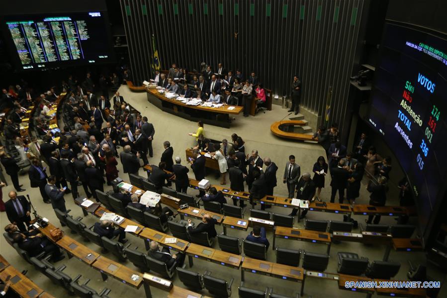 BRASILIA, 25 oct (Xinhua) -- El pleno de la Cámara de Diputados de Brasil rechazó hoy una denuncia por tentativa de obstrucción de justicia y asociación ilícita contra el presidente Michel Temer, presentada por la Procuraduría General de la República (PGR).