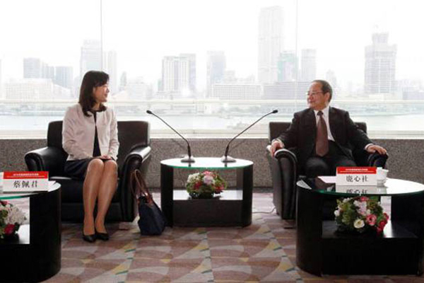 Pei-Chun Tsai (izquierda) habla con Lu Xinshe, jefe del PCCh de Jiangxi. [Foto: gwytb.gov.cn]