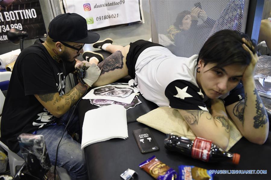 Un tatuador realiza un tatuaje a una mujer durante la 5 Convención de Tatuajes, en la Intendencia de Montevideo, en Montevideo, capital de Uruguay, el 28 de octubre de 2017. De acuerdo con información de la prensa local, la 5 Convención de Tatuajes se lleva a cabo los días 28 y 29 de octubre en Montevideo. (Xinhua/Nicolás Celaya)