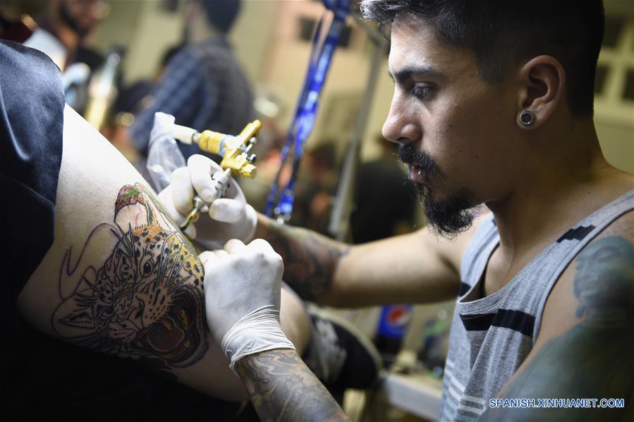 MONTEVIDEO, octubre 28, 2017 (Xinhua) -- Un tatuador realiza un tatuaje a una persona durante la 5 Convención de Tatuajes, en la Intendencia de Montevideo, en Montevideo, capital de Uruguay, el 28 de octubre de 2017. De acuerdo con información de la prensa local, la 5 Convención de Tatuajes se lleva a cabo los días 28 y 29 de octubre en Montevideo. (Xinhua/Nicolás Celaya)