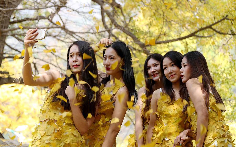 Zhengzhou,31/10/2017(El Pueblo en Línea)-Cinco estudiantes universitarias visten ropa hecha de "oro de gingko" de la monta?a Baiyun en Luoyang, provincia de Henan, 29 de octubre del 2017. Las estudiantes cursan dise?o de moda en Zhengzhou. [Foto: VCG]