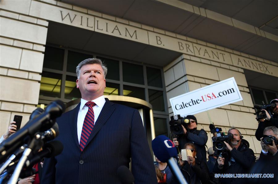 Kevin Downing (i), abogado de Paul Manafort, exjefe de campa?a del presidente estadounidense Donald Trump, conversa con representantes de los medios de comunicación luego de una audiencia relacionada con la presunta intervención rusa en las elecciones de 2016, frente a la Corte Federal de Distrito, en Washington D.C., Estados Unidos, el 30 de octubre de 2017. Tres de los colaboradores de la campa?a del presidente Donald Trump fueron acusados el lunes de manera formal y dos de ellos se declararon no culpables. (Xinhua/Yin Bogu)
