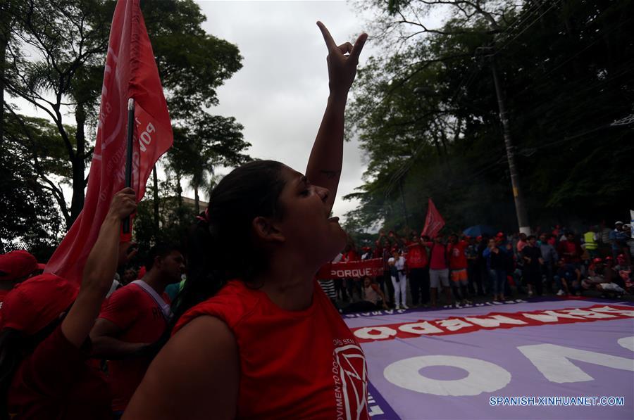 Miembros del Movimiento de los Trabajadores Sin Techo (MTST) gritan consignas durante una protesta frente a la sede del Palacio de los Bandeirantes, sede oficial del Gobierno del Estado de Sao Paulo, en Sao Paulo, Brasil, el 31 de octubre de 2017. Miembros del MTST protestaron frente a la sede del Palacio de Gobierno de Sao Paulo después de realizar una marcha de 23 kilómetros desde la ciudad de Sao Bernardo do Campo hasta Sao Paulo en demanda de vivienda, de acuerdo con información de la prensa local. (Xinhua/Rahel Patrasso)