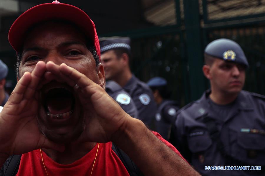 SAO PAULO, octubre 31, 2017 (Xinhua) -- Un miembro del Movimiento de los Trabajadores Sin Techo (MTST) grita consignas durante una protesta frente a la sede del Palacio de los Bandeirantes, sede oficial del Gobierno del Estado de Sao Paulo, en Sao Paulo, Brasil, el 31 de octubre de 2017. Miembros del MTST protestaron frente a la sede del Palacio de Gobierno de Sao Paulo después de realizar una marcha de 23 kilómetros desde la ciudad de Sao Bernardo do Campo hasta Sao Paulo en demanda de vivienda, de acuerdo con información de la prensa local. (Xinhua/Rahel Patrasso)