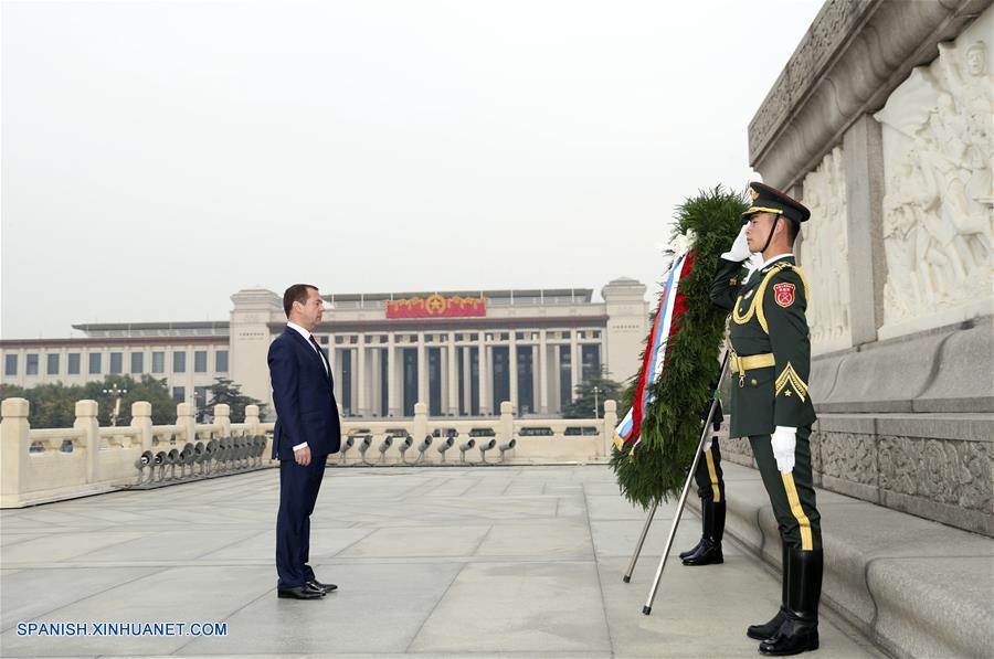 El primer ministro de Rusia, Dmitry Medvedev, deposita una ofrenda floral en el Monumento de los Héroes del Pueblo en la Plaza de Tian'anmen en Beijing, capital de China, el 31 de octubre de 2017. (Xinhua/Ding Haitao)