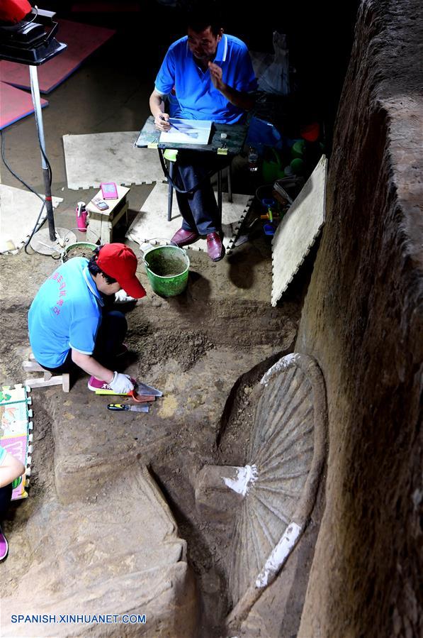 HENAN, noviembre 1, 2017 (Xinhua) -- Imagen del 15 de junio de 2017 de arqueólogos trabajando en el Pozo Hoyo No. 3 Caballo y Carro cerca de la ciudad de Xinzheng, provincia de Henan, en el centro de China. Arqueólogos en la provincia de Henan han encontrado en una excavación un hoyo con caballos y carros de hace 2,400 a?os al lado de una tumba que posiblemente perteneciese a un se?or. El Hoyo No. 3 Caballo y Carro es una de las agrupaciones de tumbas pertenecientes a familias nobles del Estado Zheng, un estado vasallo durante el periodo de Primavera y Oto?o (770 a.C -476 a.C) del periodo de Reinos Combatientes (475 a.C - 221 a.C), cerca de la ciudad de Xinzheng. Desde febrero, se han desenterrado del hoyo, el mayor de los tres dentro del grupo que se ha excavado hasta el momento, cuatro carros y 90 esqueletos de caballos. (Xinhua/Zhu Xiang)