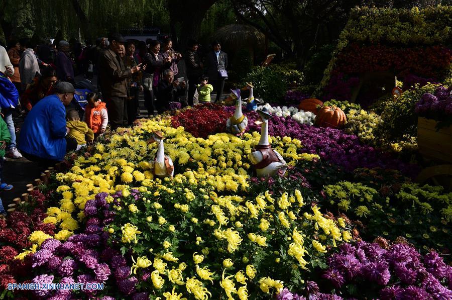 JINAN, noviembre 2, 2017 (Xinhua) -- Personas visitan las flores de crisantemo en el Parque Primavera de Baotu, en Jinan, ciudad capital de la provincia de Shandong, en el este de China, el 2 de noviembre de 2017. Más de 500 variedades de crisantemo son exhibidas en la 38 Exposición del Crisantemo del Parque Primavera de Baotu que permanecerá hasta el 25 de noviembre. (Xinhua/Li Ziheng)