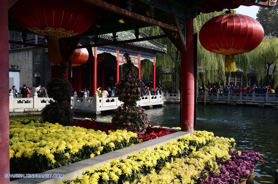 JINAN, noviembre 2, 2017 (Xinhua) -- Personas visitan las flores de crisantemo en el Parque Primavera de Baotu, en Jinan, ciudad capital de la provincia de Shandong, en el este de China, el 2 de noviembre de 2017. Más de 500 variedades de crisantemo son exhibidas en la 38 Exposición del Crisantemo del Parque Primavera de Baotu que permanecerá hasta el 25 de noviembre. (Xinhua/Guo Xulei)