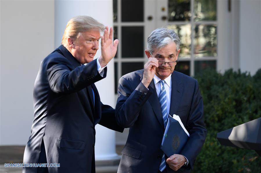 El presidente de Estados Unidos, Donald Trump (i), y el gobernador de la Reserva Federal, Jerome Powell (d), asisten a una ceremonia de nominación en el Jardín de las Rosas de la Casa Blanca, en Washington D.C., capital de Estados Unidos, el 2 de noviembre de 2017. (Xinhua/Yin Bogu)