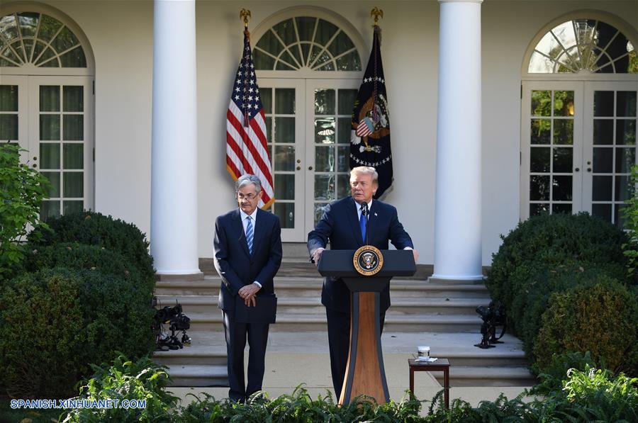 El presidente de Estados Unidos, Donald Trump (d), pronuncia un discurso durante una ceremonia de nominación con el gobernador de la Reserva Federal, Jerome Powell (i), en el Jardín de las Rosas de la Casa Blanca, en Washington D.C., capital de Estados Unidos, el 2 de noviembre de 2017. (Xinhua/Yin Bogu)