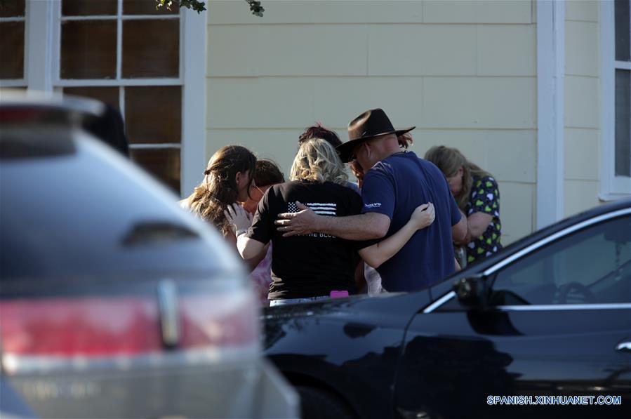 TEXAS, noviembre 5, 2017 - Personas se reúnen para orar frente a un Centro Comunitario en San Antonio, estado de Texas, Estados Unidos, el 5 de noviembre de 2017. El comisionado del condado de Wilson, Larry Wiley, dijo que 27 personas murieron y que otras 20 resultaron lesionadas cuando un hombre entró el domingo cerca de las 11:30 hora local en la iglesia. De acuerdo con Wiley, el hombre armado fue abatido a unos nueve kilómetros de distancia en el condado de Guadalupe después de ser arrinconado por ayudantes del alguacil. (Xinhua/San Antonio Express-News/ZUMAPRESS)