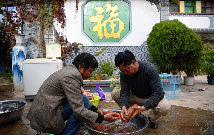 Liu y su amigo lavan las patatas antes de pintarlas. [Foto / VCG]