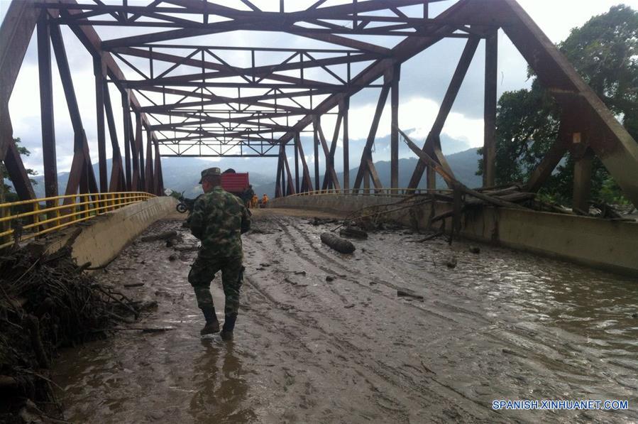 CAUCA, noviembre 8, 2017 (Xinhua) -- Un militar camina a través de un puente cubierto de barro luego de una avalancha de lodo y piedras a causa del desbordamiento del río Paila, en el municipio de Corinto del departamento de Cauca, Colombia, el 8 de noviembre de 2017. Al menos cuatro personas muertas, 28 heridas y 18 desaparecidas dejó una avalancha de lodo y piedras en la población colombiana de Corinto, informaron autoridades. El gobernador del departamento Cauca, Oscar Campo, afirmó que la emergencia se presentó la noche del martes a raíz de las fuertes lluvias de los últimos días, que desbordaron las aguas del río La Paila, afectando a unas 8.000 personas de esa localidad. (Xinhua/Ejercito Nacional/COLPRENSA)
