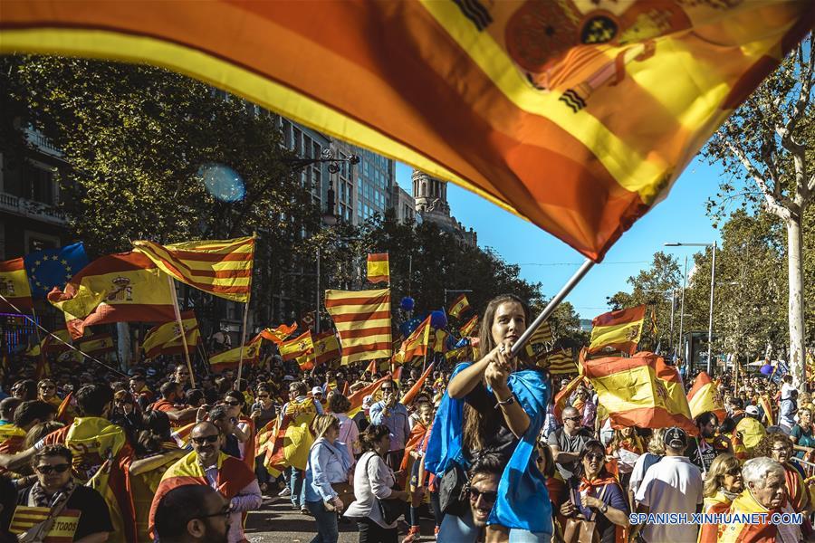 Personas participan durante una protesta en contra de la independencia de Catalu?a, en Barcelona, Espa?a, el 29 de octubre de 2017. Bajo el lema "Todos somos Catalu?a", unos 1.3 millones de personas, según la plataforma Sociedad Civil Catalana (SCC), organizadora del evento, se manifestaron el domingo por las calles de Barcelona en contra de la declaración de independencia realizada el viernes por el Parlamento de Catalu?a y a favor de la unidad de Espa?a. (Xinhua/Matthias Oesterle/ZUMAPRESS)