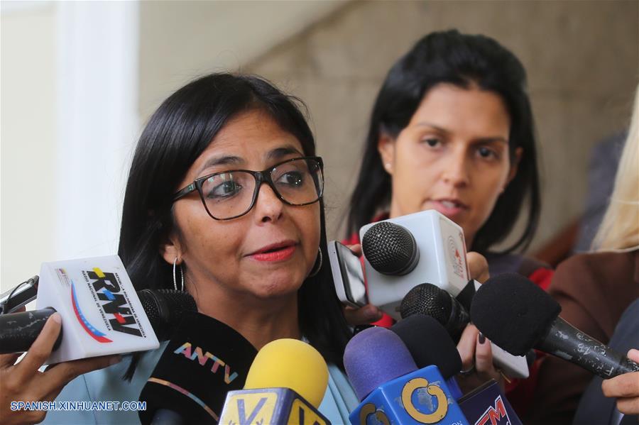 La presidenta de la Asamblea Nacional Constituyente (ANC), Delcy Rodríguez (i), conversa con representantes de los medios de comunicación luego de una sesión plenaria de la ANC, en el Palacio Federal Legislativo, en Caracas, Venezuela, el 8 de noviembre de 2017. (Xinhua/Zurimar Campos/AVN)