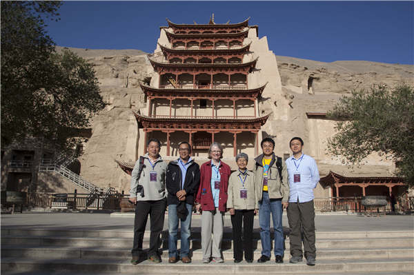 Mimi Gates (tercera a la izquierda) y Fan Jinshi (cuarto a la izquierda), exjefe de la Academia de Investigación de Dunhuang. Ellos han trabajado juntos durante muchos a?os. [Foto: Ding Xiaosheng]
