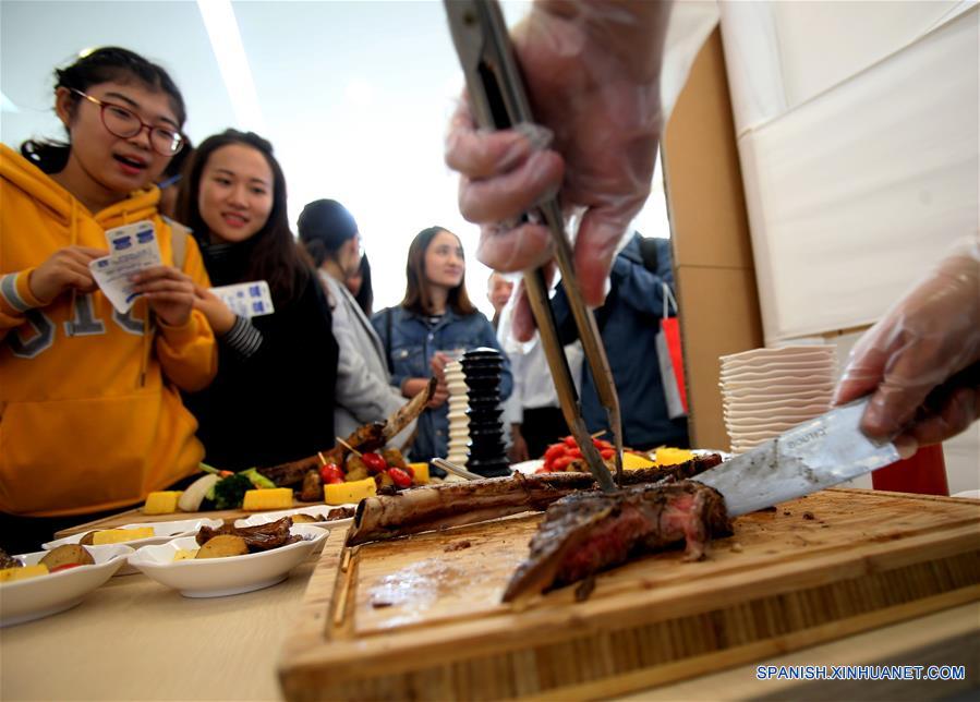 Filetes a la parrilla cocinados por la Universidad de Shanghai para Ciencia y Tecnología son servidos en la Universidad Fudan en Shanghai, en el este de China, el 11 de noviembre de 2017. El primer Festival Universitario de Comida de Shanghai comenzó el sábado, reuniendo platillos de los comedores de 15 universidades. (Xinhua/Liu Ying)