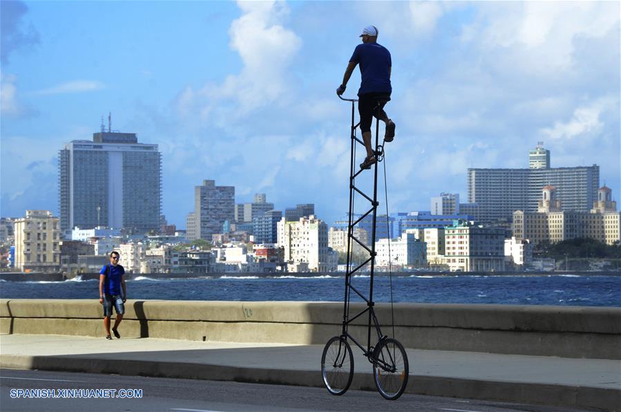 LA HABANA, noviembre 12, 2017 (Xinhua) -- Imagen del 11 de noviembre de 2017, de Félix Guirola conduciendo su bicicleta por la avenida del Malecón habanero en La Habana, Cuba. El cubano Félix Guirola no le teme a las alturas, por eso anda por las calles de La Habana sobre una singular bicicleta de casi cuatro metros de altura. Guirola ha remodelado varias bicicletas desde aquel 14 de agosto de 1981, cuando con una de casi dos metros se convirtió en la principal atracción de los carnavales de la central ciudad cubana de Ciego de ávila, donde nació hace 52 a?os. El día antes había visto por primera vez en su vida un tándem que trató infructuosamente de comprar, y ante la frustración decidió construir su propio modelo, pero muy diferente, porque en vez de crecer en longitud, aumentó poco a poco en altura. Guirola asegura que en aquellos a?os tuvo el récord mundial de la bicicleta más alta desde 1987 hasta 2004, pero nadie se enteró, pues solo conocían de sus haza?as los vecinos de Ciego de ávila. Desde hace siete a?os, en noviembre de 2010, Guirola se mudó a La Habana, donde vive en los bajos de un viejo edificio "art decó", en el cual tiene un peque?o taller donde trabaja con hierros y partes de bicicletas, fundamentalmente de fabricación china, de las marcas Flying Pigeon y Forever. En la capital de la isla, superar el récord Guinness se convirtió en una verdadera obsesión, y con un ciclo de 7.3 metros llegó a superar al estadounidense Richie Trimble, que tenía una marca de 6.15 metros. En un desafío a las leyes de la física, Guirola dice que el único límite que tiene son los materiales, y asegura que "no tendría limitaciones de altura si tuviera la posibilidad de tener los materiales necesarios, que no fueran tan pesados". (Xinhua/Joaquín Hernández)