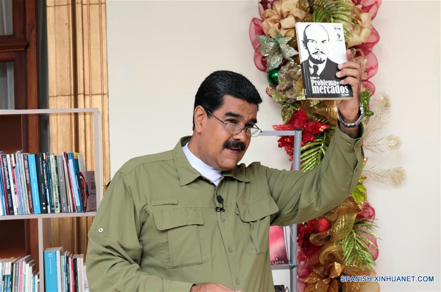 CARACAS, noviembre 12, 2017 (Xinhua) -- Imagen cedida por la Presidencia de Venezuela, del presidente de Venezuela, Nicolás Maduro participando durante la transmisión de su programa "Los Domingos con Maduro", desde la 13 Edición de la Feria Internacional del Libro de Venezuela (FILVEN), inaugurada en el Teatro Teresa Carre?o, en Caracas, Venezuela, el 12 de noviembre de 2017. El presidente de Venezuela, Nicolás Maduro, aseguró el domingo que a su país "nunca" llegará el "default" (impago), porque el gobierno seguirá cumpliendo sus compromisos con los acreedores internacionales. "Han jugado a que Venezuela se declare en "default". Nunca, el "default nunca llegará a Venezuela, nunca llegará", dijo Maduro durante su programa semanal. (Xinhua/Presidencia de Venezuela)