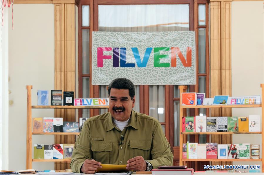 CARACAS, noviembre 12, 2017 (Xinhua) -- Imagen cedida por la Presidencia de Venezuela, del presidente de Venezuela, Nicolás Maduro participando durante la transmisión de su programa "Los Domingos con Maduro", desde la 13 Edición de la Feria Internacional del Libro de Venezuela (FILVEN), inaugurada en el Teatro Teresa Carre?o, en Caracas, Venezuela, el 12 de noviembre de 2017. El presidente de Venezuela, Nicolás Maduro, aseguró el domingo que a su país "nunca" llegará el "default" (impago), porque el gobierno seguirá cumpliendo sus compromisos con los acreedores internacionales. "Han jugado a que Venezuela se declare en "default". Nunca, el "default nunca llegará a Venezuela, nunca llegará", dijo Maduro durante su programa semanal. (Xinhua/Presidencia de Venezuela)