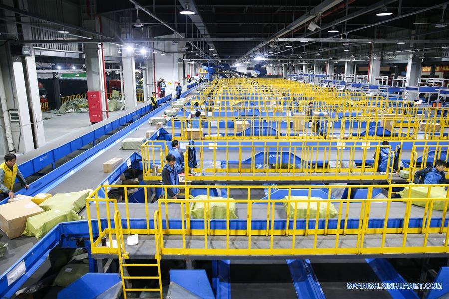 Empleados trabaja en el centro de distribución de ZTO Express, en Shanghai, en el este de China, el 12 de noviembre de 2017. Empresas de mensajería se encontraban trabajando a máxima velocidad para realizar un gran número de entregas luego de las ventas en línea del Día de los Solteros de Alibaba del 11 de noviembre. (Xinhua/Ding Ting)