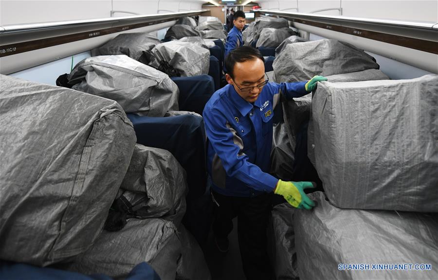Empleados acomodan paquetes en un tren, en una estación de trenes en Lanzhou, capital de la provincia de Gansu, en el noroeste de China, el 11 de noviembre de 2017. Las empresas de logística han trabajando a máxima velocidad para realizar un gran número de entregas luego de las ventas en línea del Día de los Solteros de China el sábado. (Xinhua/Chen Bin)