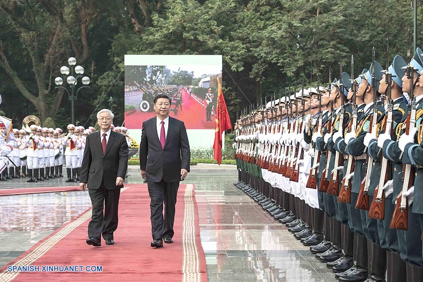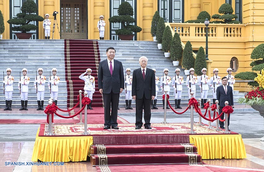 Antes de las conversaciones, Xi asistió a una gran ceremonia de bienvenida ofrecida por Trong con honores militares completos y un saludo de 21 salvas.