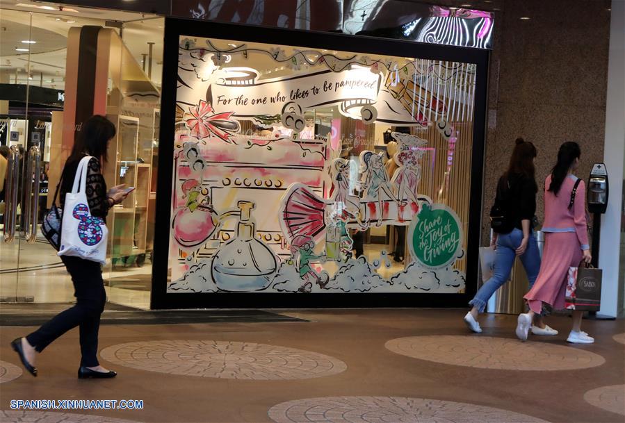 HONG KONG, noviembre 16, 2017 (Xinhua) -- Personas caminan frente a decoraciones navide?as en un centro comercial, en Causeway Bay de Hong Kong, en el sur de China, el 16 de noviembre de 2017. (Xinhua/Li Peng)