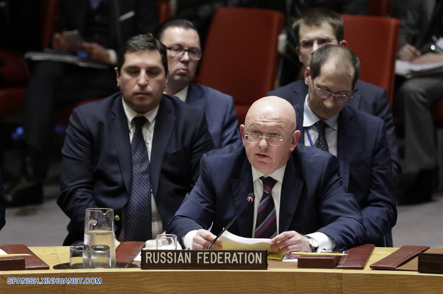 El embajador de Rusia ante la Organización de las Naciones Unidas (ONU), Vassily Nebenzia (c-frente), pronuncia un discurso luego de que el Consejo de Seguridad de la ONU no pudiera adoptar una resolución elaborada por Estados Unidos para renovar el mandato del mecanismo que investiga los ataques químicos en Siria, en la sede de la ONU, en Nueva York, Estados Unidos, el 16 de noviembre de 2017.(Xinhua/Li Muzi)