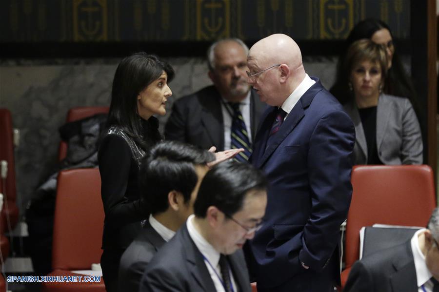 La embajadora de Estados Unidos ante la Organización de las Naciones Unidas (ONU), Nikki Haley (i), conversa con el embajador de Rusia ante la ONU, Vassily Nebenzia (d-frente), previo a una reunión del Consejo de Seguridad de la ONU para votar sobre una resolución elaborada por Estados Unidos para renovar el mandato del mecanismo que investiga los ataques químicos en Siria, en la sede de la ONU, en Nueva York, Estados Unidos, el 16 de noviembre de 2017. (Xinhua/Li Muzi)